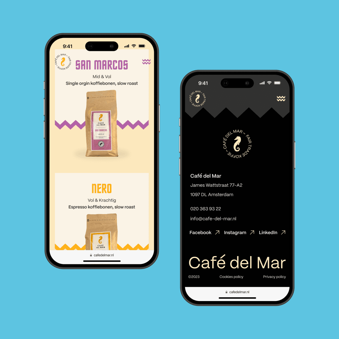 Zie je al die bewegende effecten en elementen? Achter die schijnbaar moeiteloze interacties schuilt een hoop code. Onze developers hebben alles uit de kast gehaald voor dat gewenste ‘wauw’-effect. En met succes, al zeggen we het zelf. Bij het betreden van de website wacht je meteen een pagina-animatie en daarna zit de site boordevol verrassingen. Van unieke kleurtransities tot een productgalerij die je niet loslaat. Alles is ontworpen om je onder te dompelen in de (h)eerlijke wereld van Café del Mar. Dat kunnen wij je vertellen, maar beter surf je zelf even naar de pagina.