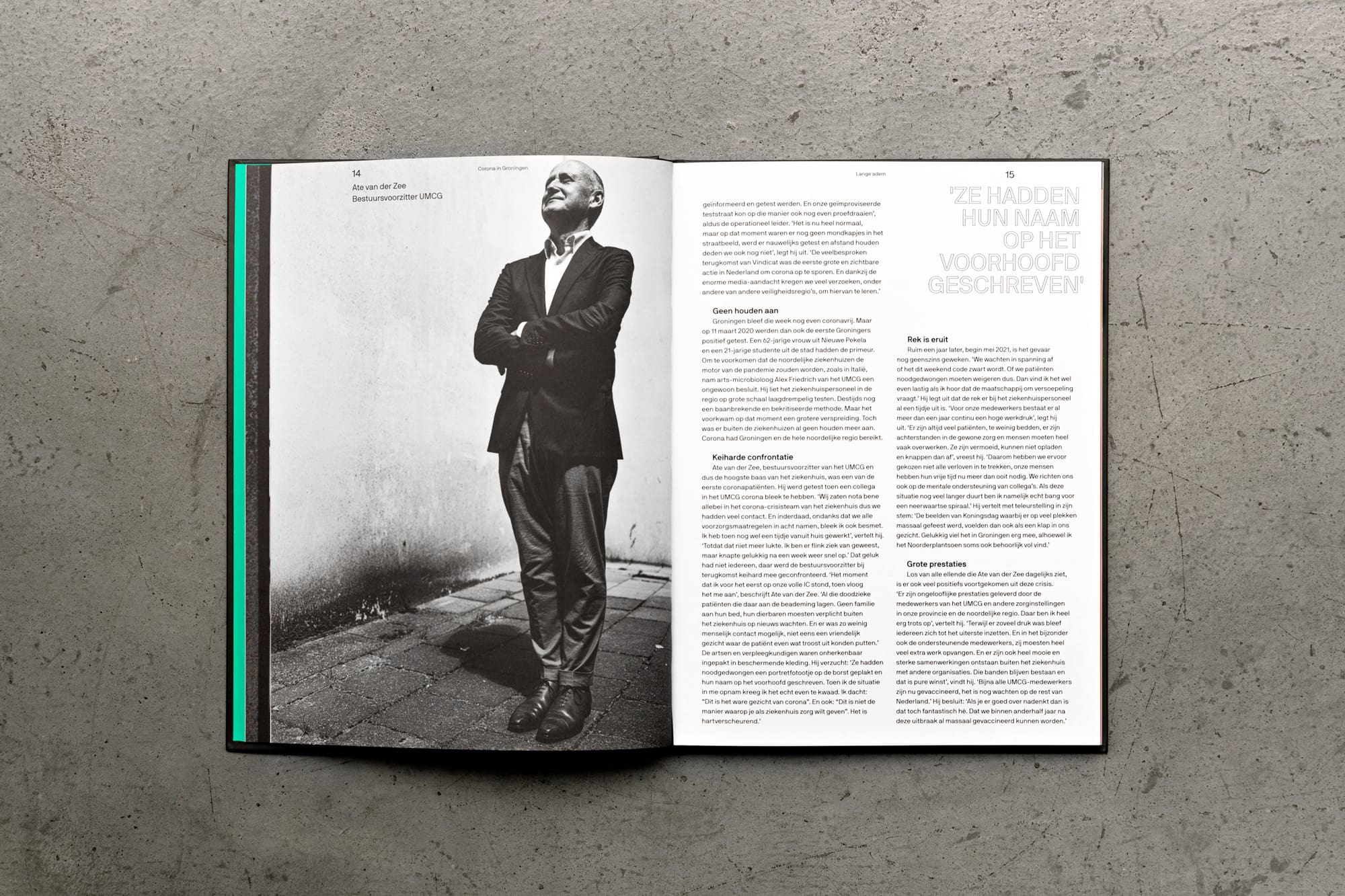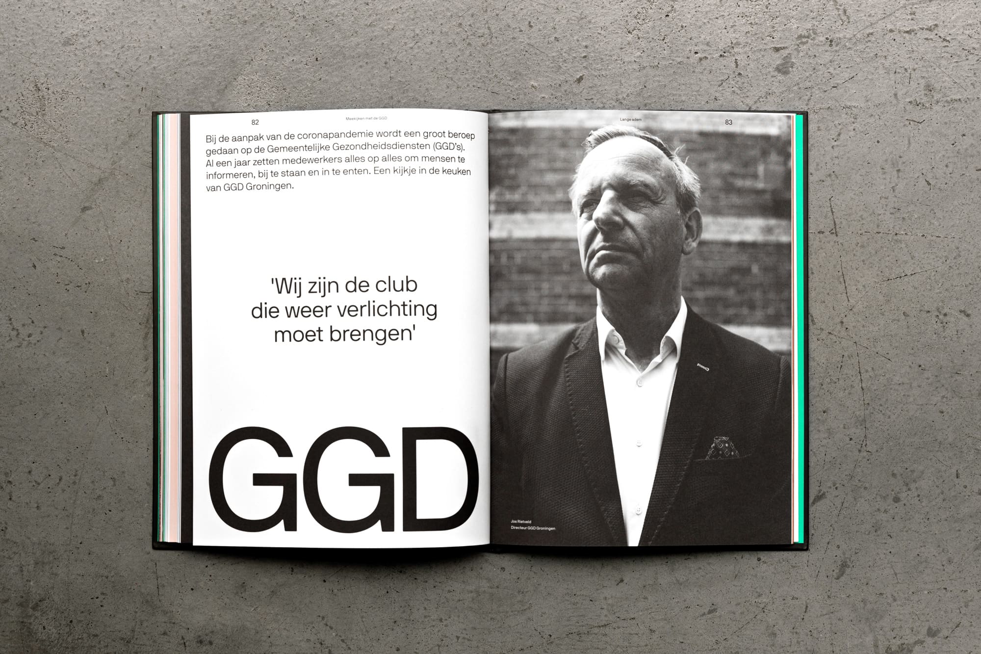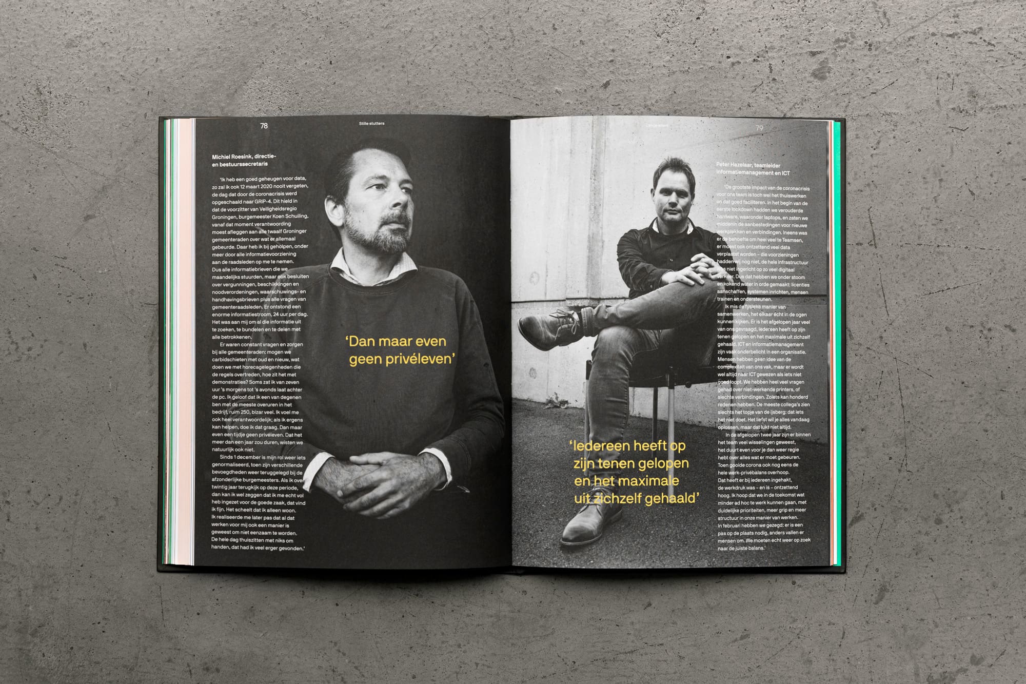 Het doel was om de verhalen ‘dicht op de mens’ en met Groningse eigenzinnigheid neer te zetten. En wie past daar beter bij dan fotograaf Joram Knol? Zijn indringende zwart-witfotografie vertelt samen met de teksten van journalisten Esther Walstra en Lieke van den Krommenacker een indrukwekkend verhaal. Aan het woord komen onder andere de rector van Vindicat (die de New York Times te woord moest staan na het beruchte skireisje), medewerkers van het geëvacueerde asielzoekerscentrum in Delfzijl en collega’s van VRG die zelf besmet raakten met het coronavirus.
