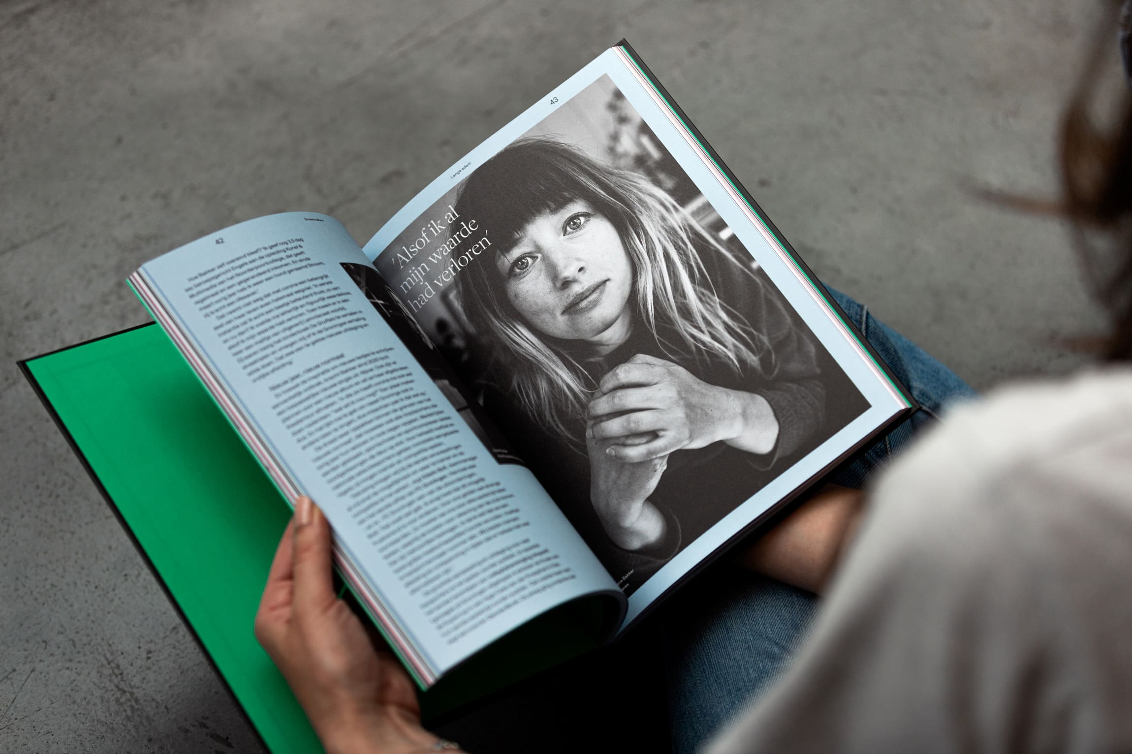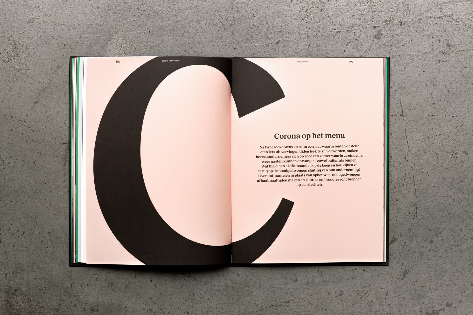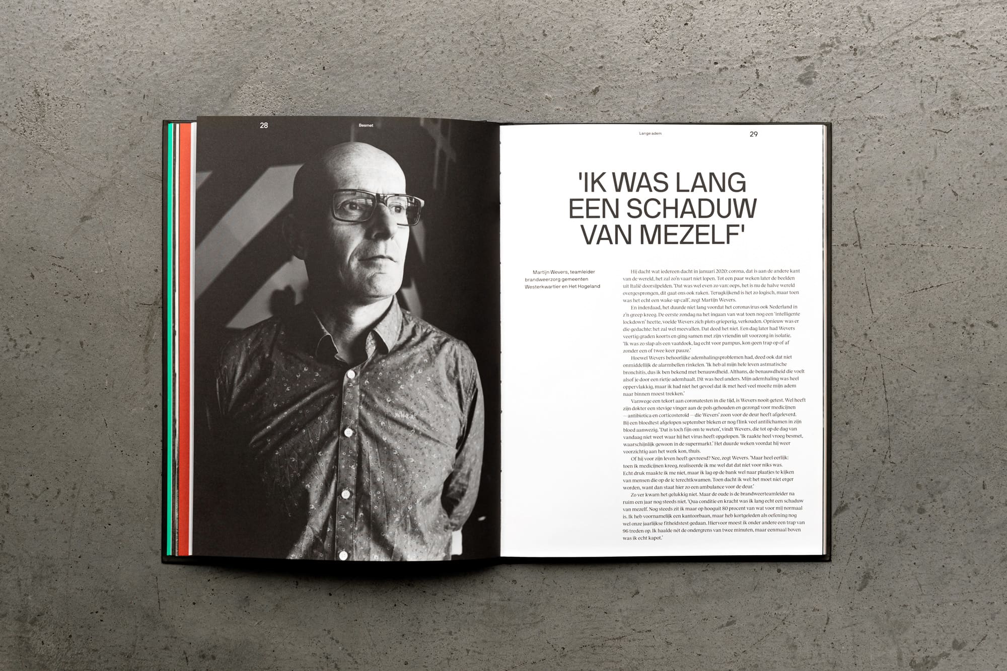 Als cover kozen we voor een abstracte weergave van een ademwolk, die de titel ‘Lange adem’ in zijn greep houdt, net zoals de provincie in de greep van corona verkeerde. In de verdere vormgeving van het boek is de mens, en daarom de fotografie centraal gezet. Door de kleurrijke, veelzijdige vormgeving komen de zwart-witportretten optimaal tot hun recht en wordt de ruimte geboden aan verhalen vanuit verschillende perspectieven.