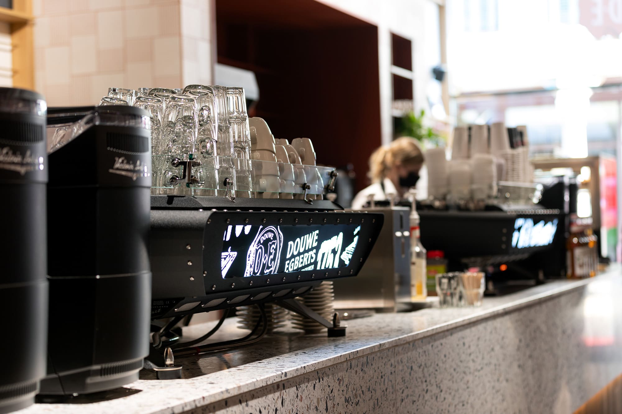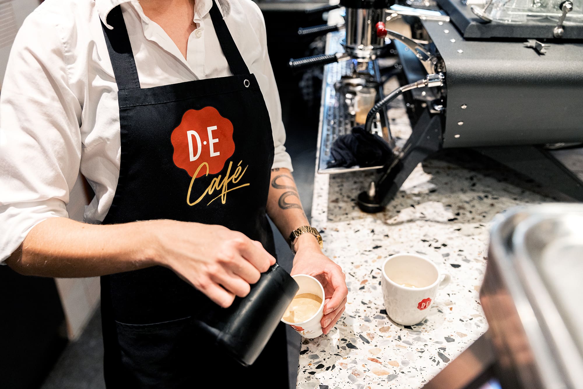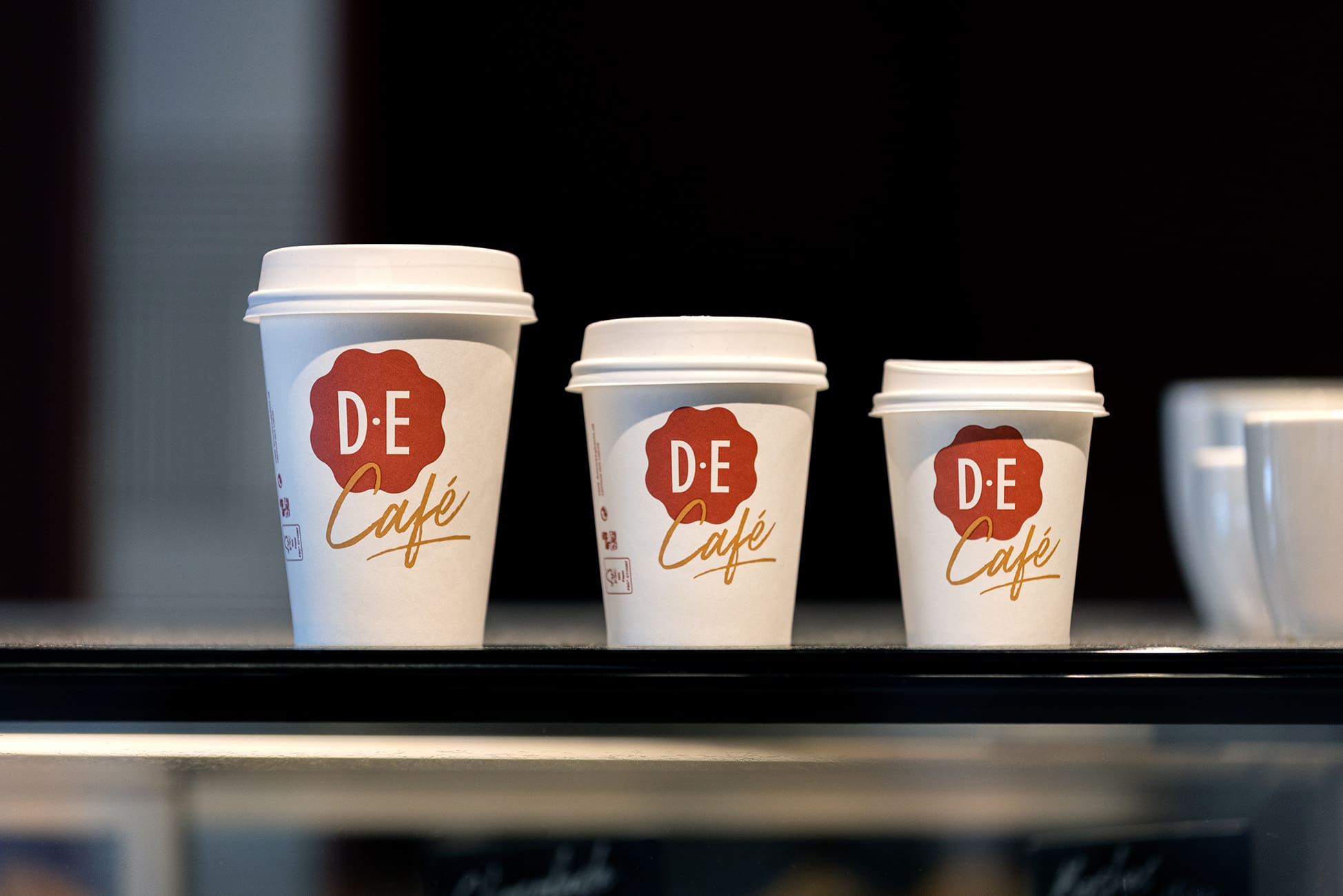 De rijke historie (van meer dan 265 jaar!) vormde een bron van inspiratie voor de brand update van Douwe Egberts Café. In zowel het interieur als de visuele identiteit komt het authentieke karakter tot leven door verschillende elementen uit het archief van DE nieuw leven in te blazen. Het expressieve handgeschreven font en de combinatie van donkergrijze met gouden kleuren weerspiegelen de warme, toegankelijke sfeer van de cafés en de gastvrijheid van de barista’s. Bovendien sluiten de vormen en kleuren naadloos aan bij de premium uitstraling van Douwe Egberts.
