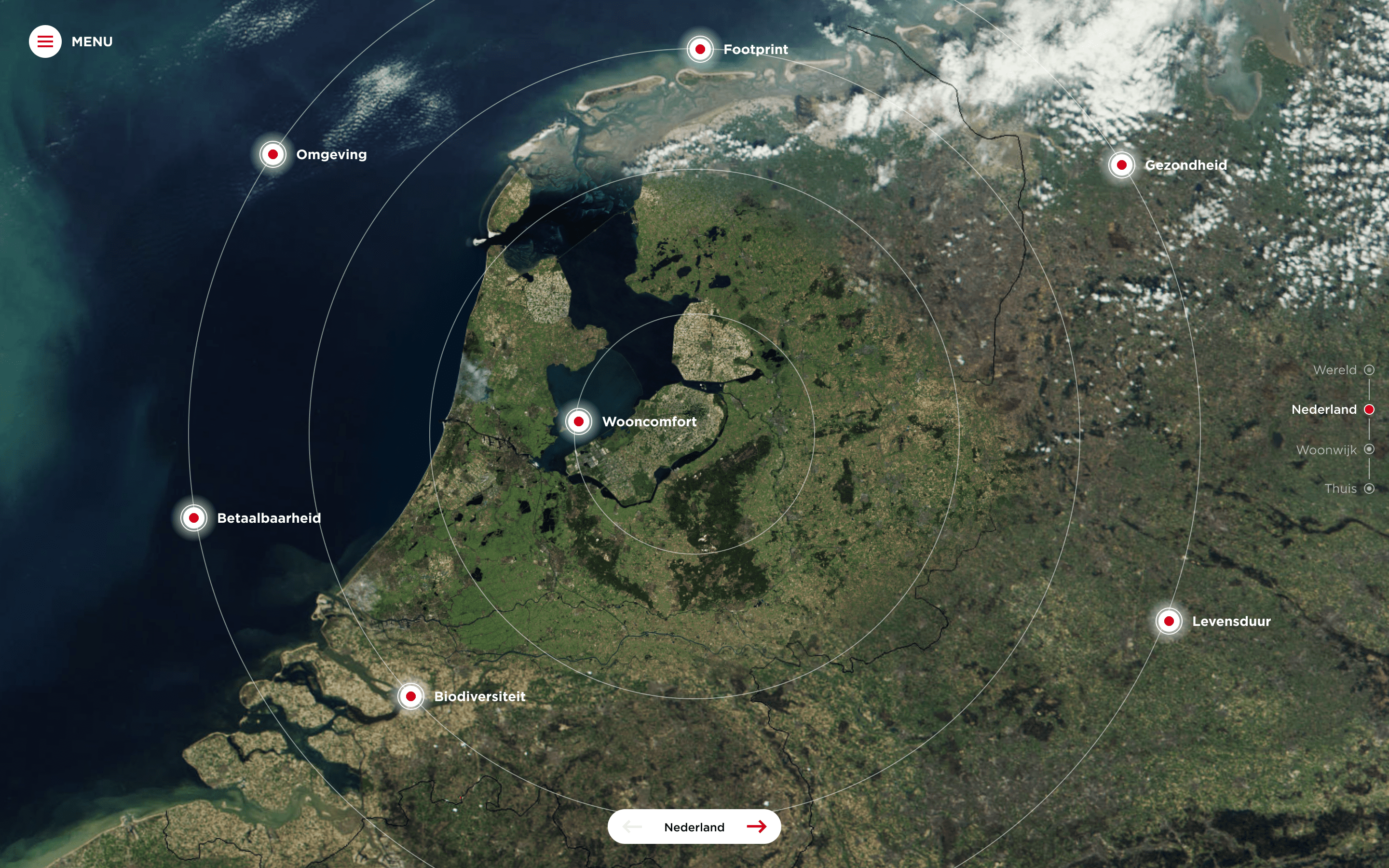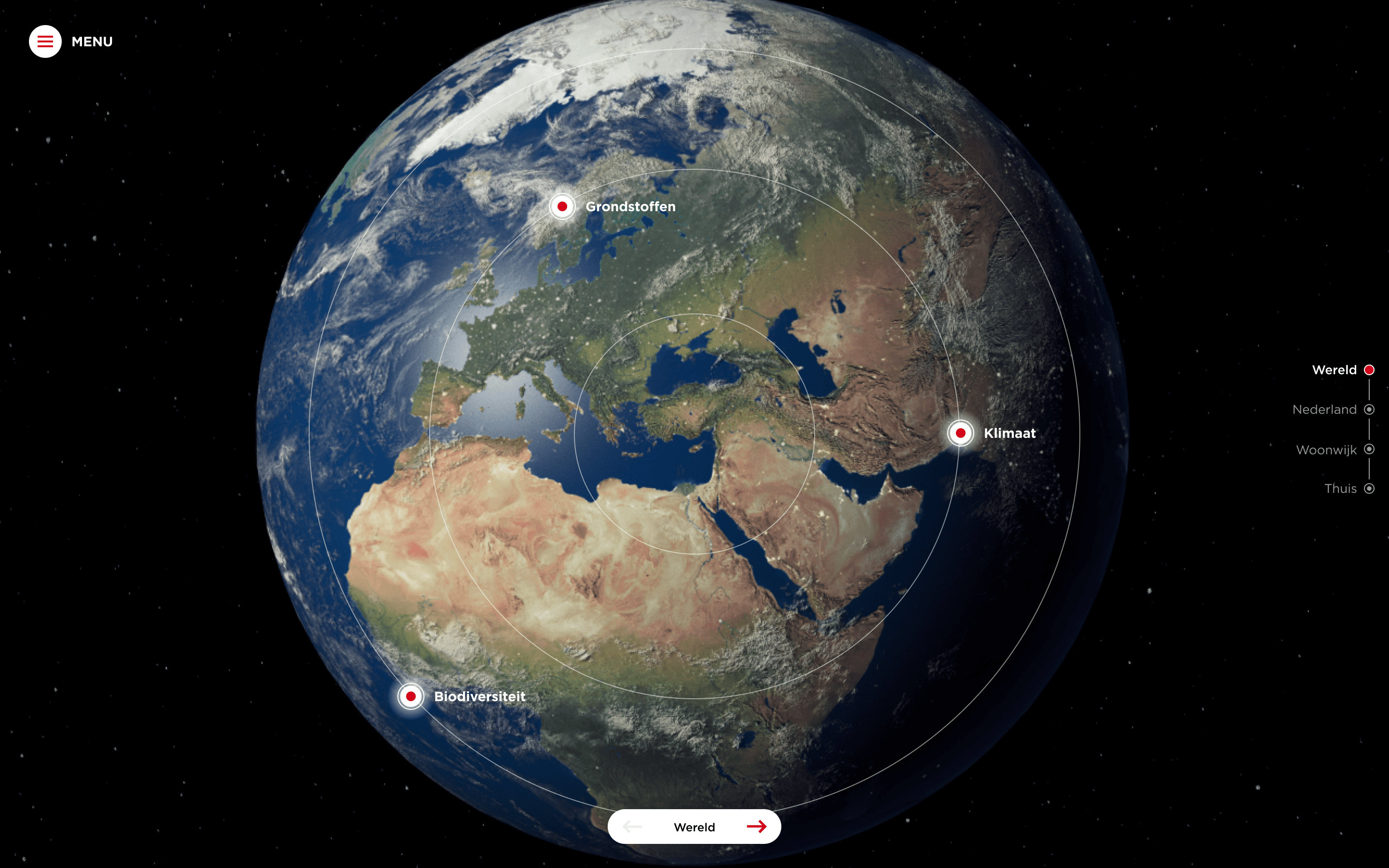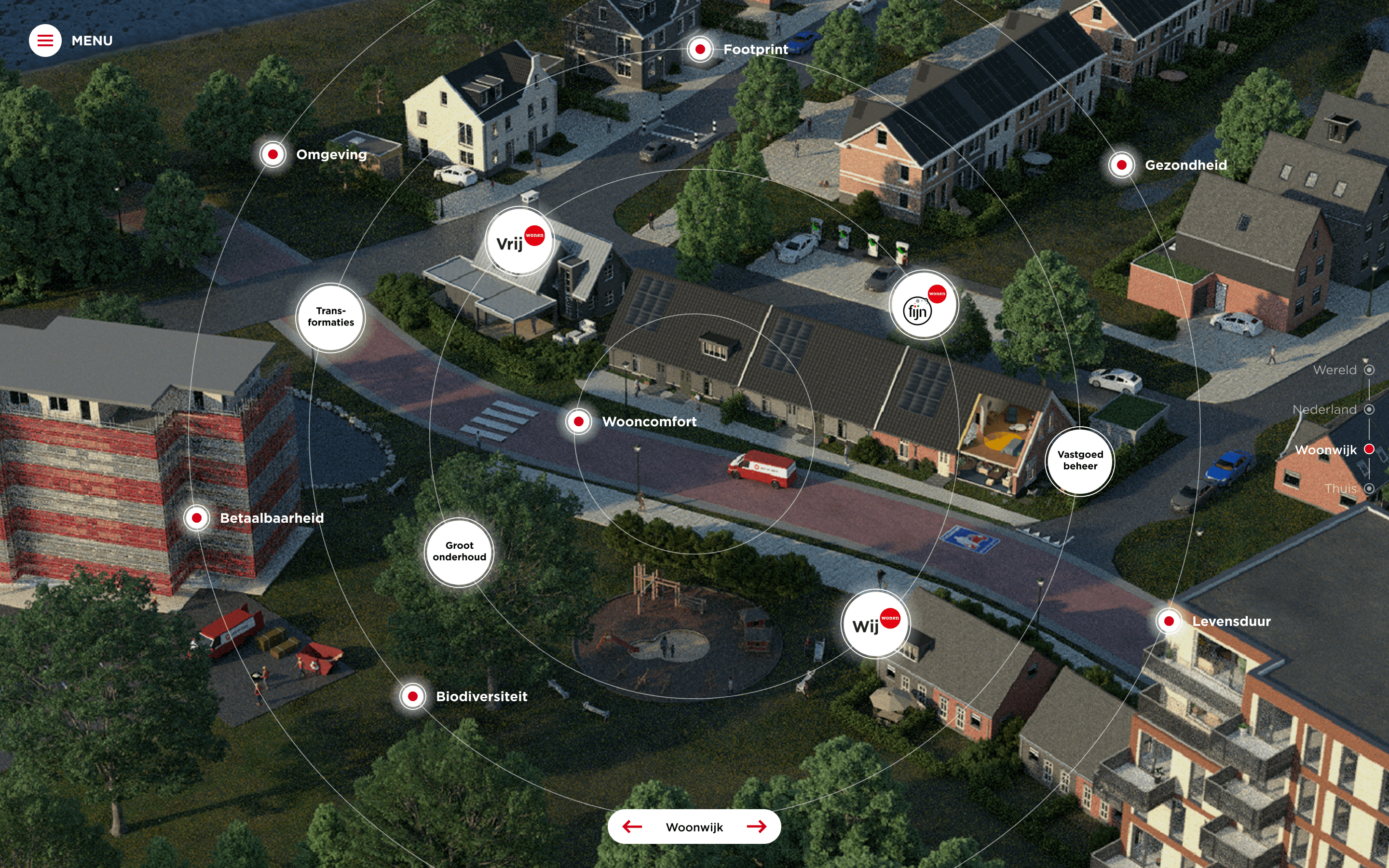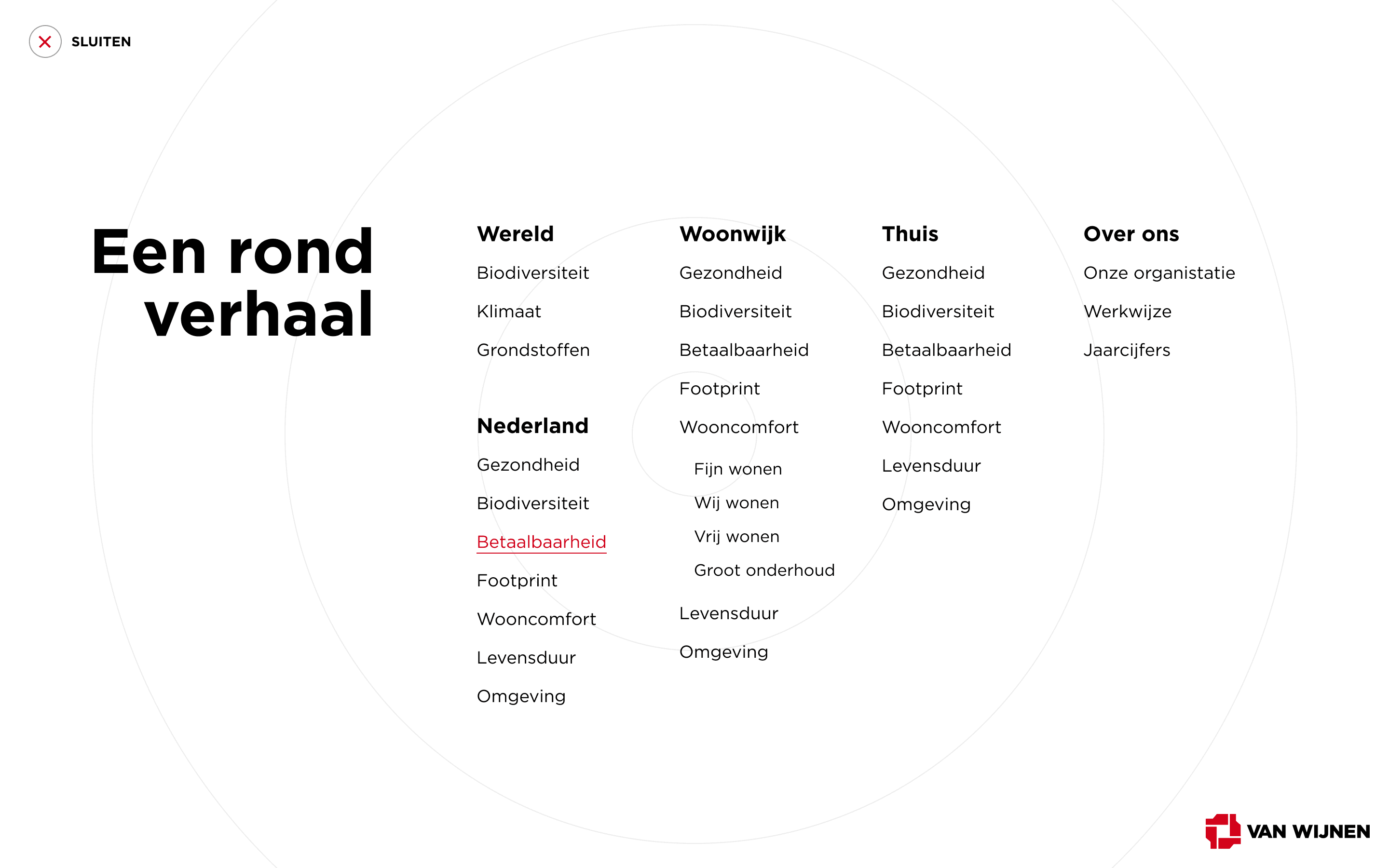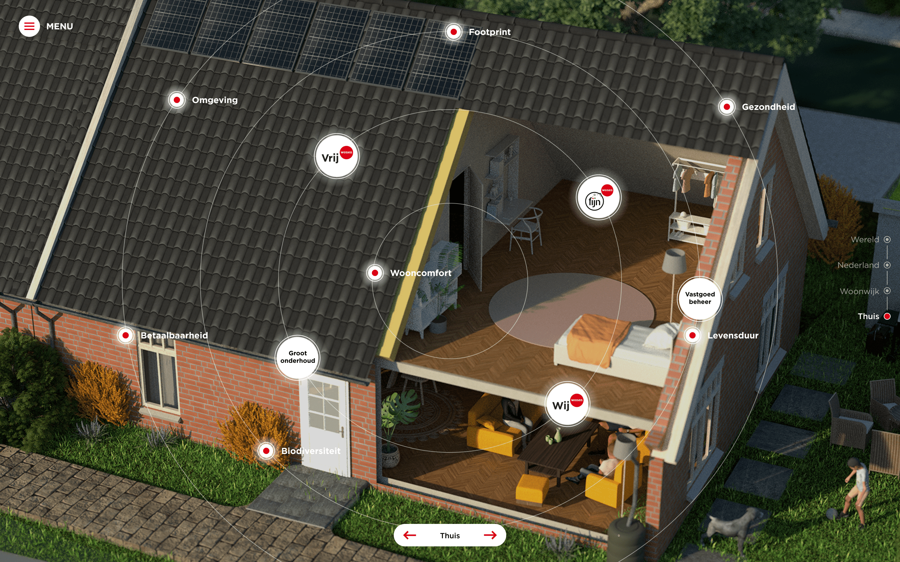 Het haakje ‘Een rond verhaal’ vormde de basis van de interactieve presentatietool. Door te navigeren tussen de verschillende niveaus: wereld, Nederland, woonomgeving en thuis, moet al in- en uitzoomend duidelijk worden wat Van Wijnen kan betekenen voor de leefomgeving van mensen. Elk niveau laat namelijk raakvlakken zien met verschillende belangrijke maatschappelijke thema’s: gezondheid, biodiversiteit, footprint, wooncomfort, levensduur en omgeving. Oftewel: Van Wijnen is all about the bigger picture.