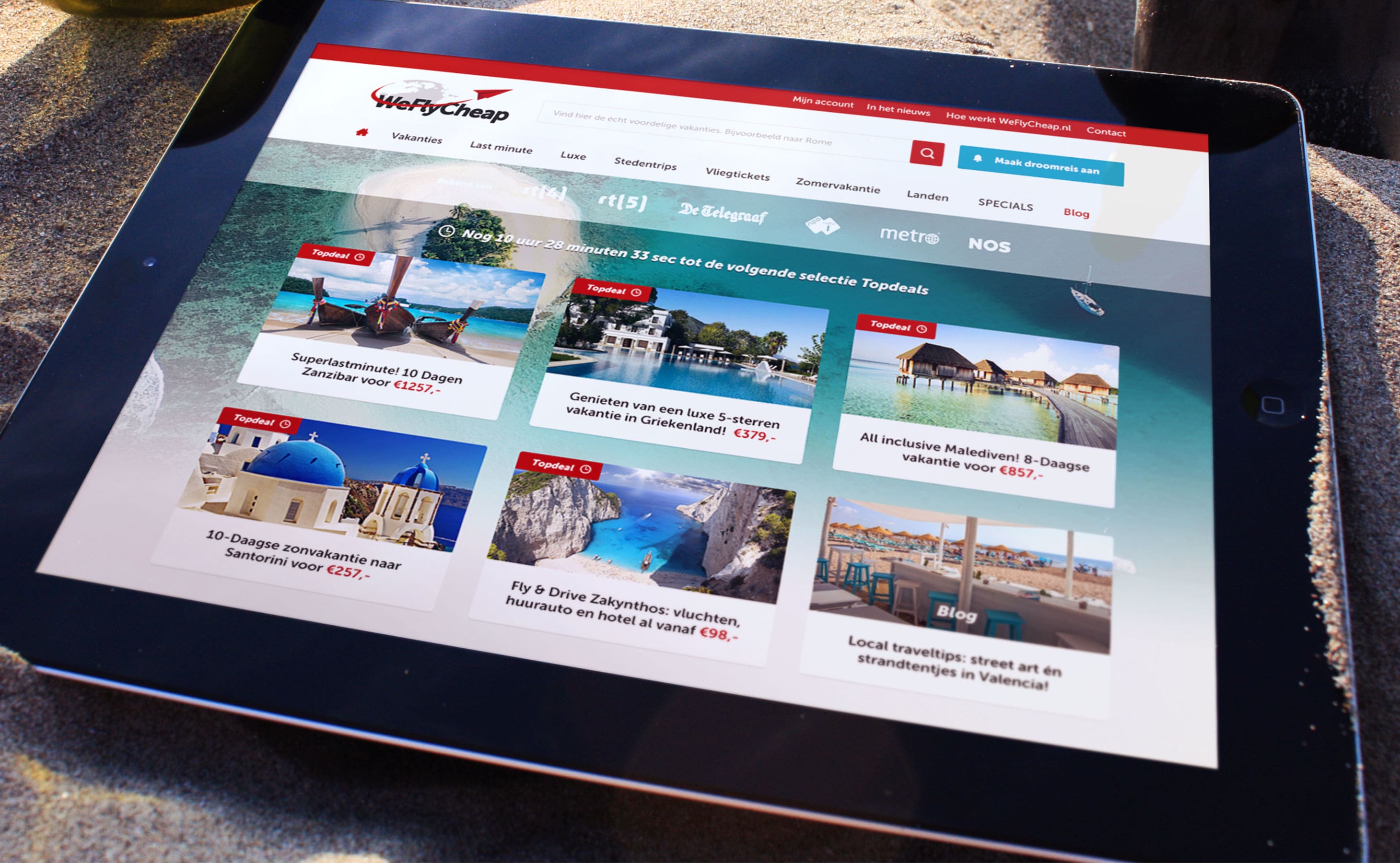 Op de website die wij voor WeFlyCheap maakten, vind je de beste vakantiedeals gemakkelijk, snel en overzichtelijk. De hele dag rondhangen op het internet is niet nodig: de bezoeker kan de website naar eigen smaak inrichten en alerts instellen om op de hoogte te blijven van droomreizen. Zo verspil je nooit kostbare vakantiedagen!