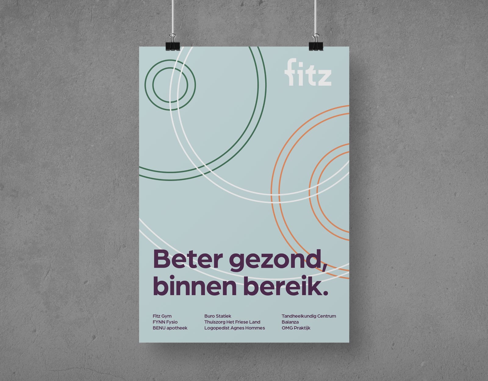Fitz staat voor verbinding. Dat begint al bij de naam. Een combinatie van ‘fit’ en de z van Zuiderburen, waar Fitz te vinden is. Het komt ook terug in het pand, waar verschillende gezondheidsdiensten elkaar weten te vinden en de lijntjes kort zijn. Terwijl dat in de reguliere praktijk juist heel anders is, daarom bedachten we ook de slogan ‘Beter gezond’. Nog zo’n verwijzing: het gebruik van cirkels in de communicatie. Niet alleen om naar de bundeling van krachten te verwijzen, maar ook als circle of life, dat weer een verwijzing naar een gezond en vitaal leven is.