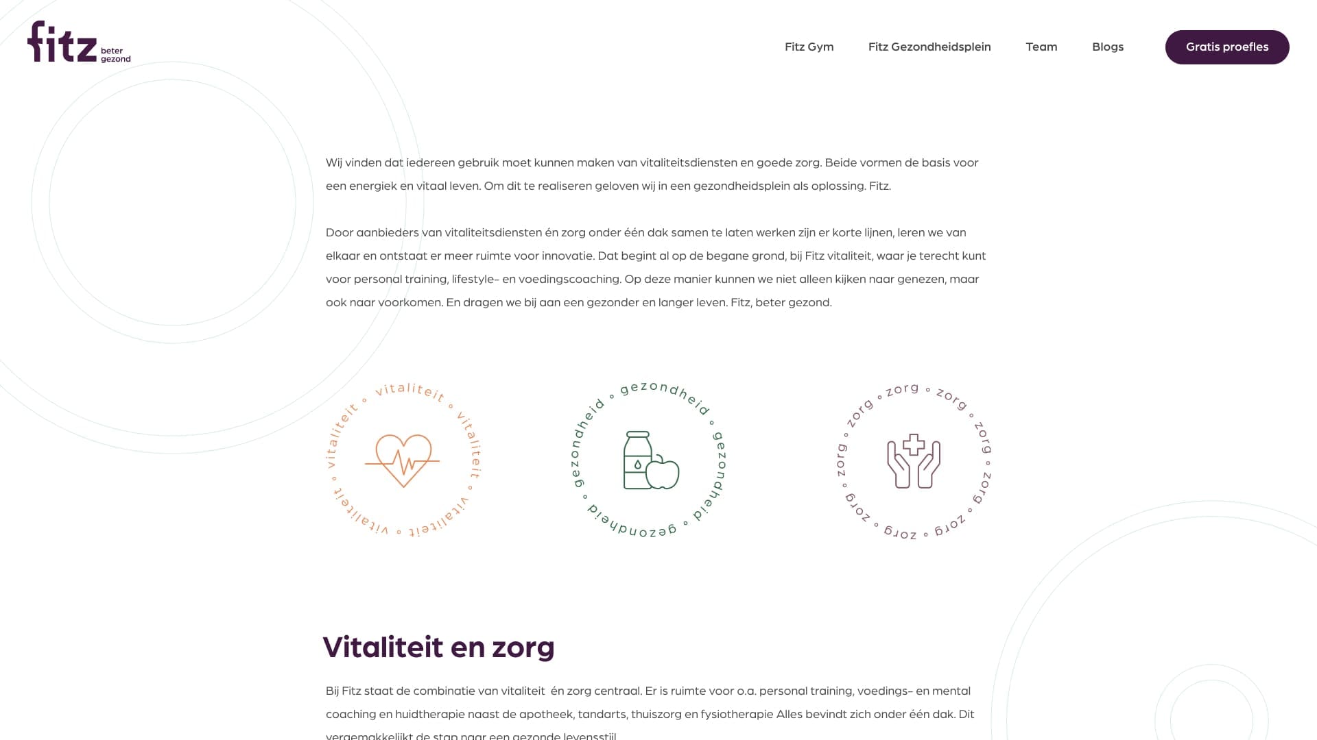 Fitz staat voor verbinding. Dat begint al bij de naam. Een combinatie van ‘fit’ en de z van Zuiderburen, waar Fitz te vinden is. Het komt ook terug in het pand, waar verschillende gezondheidsdiensten elkaar weten te vinden en de lijntjes kort zijn. Terwijl dat in de reguliere praktijk juist heel anders is, daarom bedachten we ook de slogan ‘Beter gezond’. Nog zo’n verwijzing: het gebruik van cirkels in de communicatie. Niet alleen om naar de bundeling van krachten te verwijzen, maar ook als circle of life, dat weer een verwijzing naar een gezond en vitaal leven is.