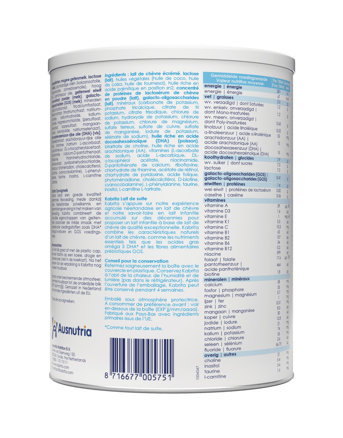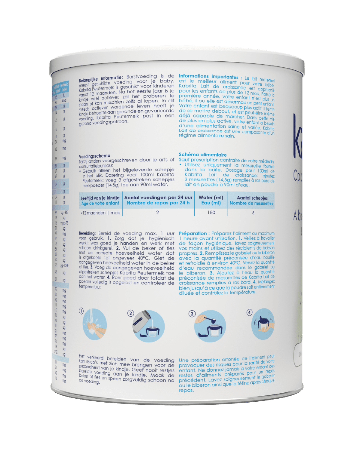 In heel Europa vind je in de schappen van supermarkten en drogisterijen de herkenbare Kabrita-blikken met, afhankelijk van het land, Engelse, Duits, Spaanse of Nederlands-Franse opschriften, maar ook vele andere Kabrita-verpakkingen. In Nederland vind je ze bij Jumbo en Etos. Daarnaast hebben wij voor Ausnutria een huisstijlhandboek voor de opmaak van verpakkingen gemaakt, waarin de keuzes van het ontwerp en de positionering van de vaste grafische elementen zijn vastgelegd. Zo kunnen nieuwe en bestaande verpakkingen in de toekomst efficiënt worden opgezet of worden aangepast.