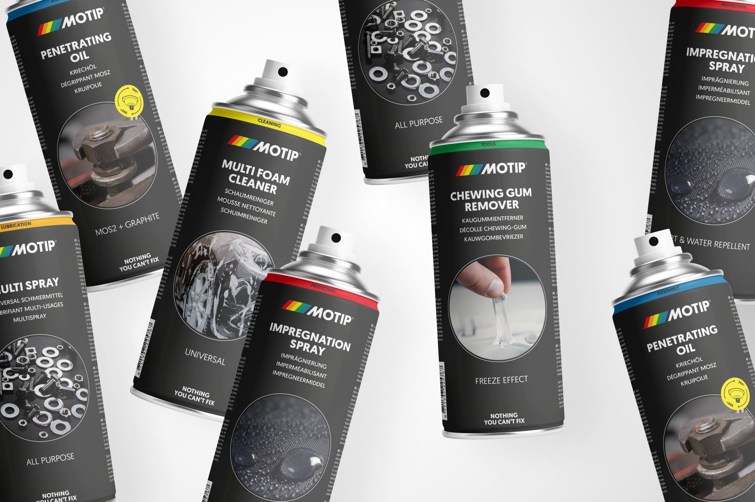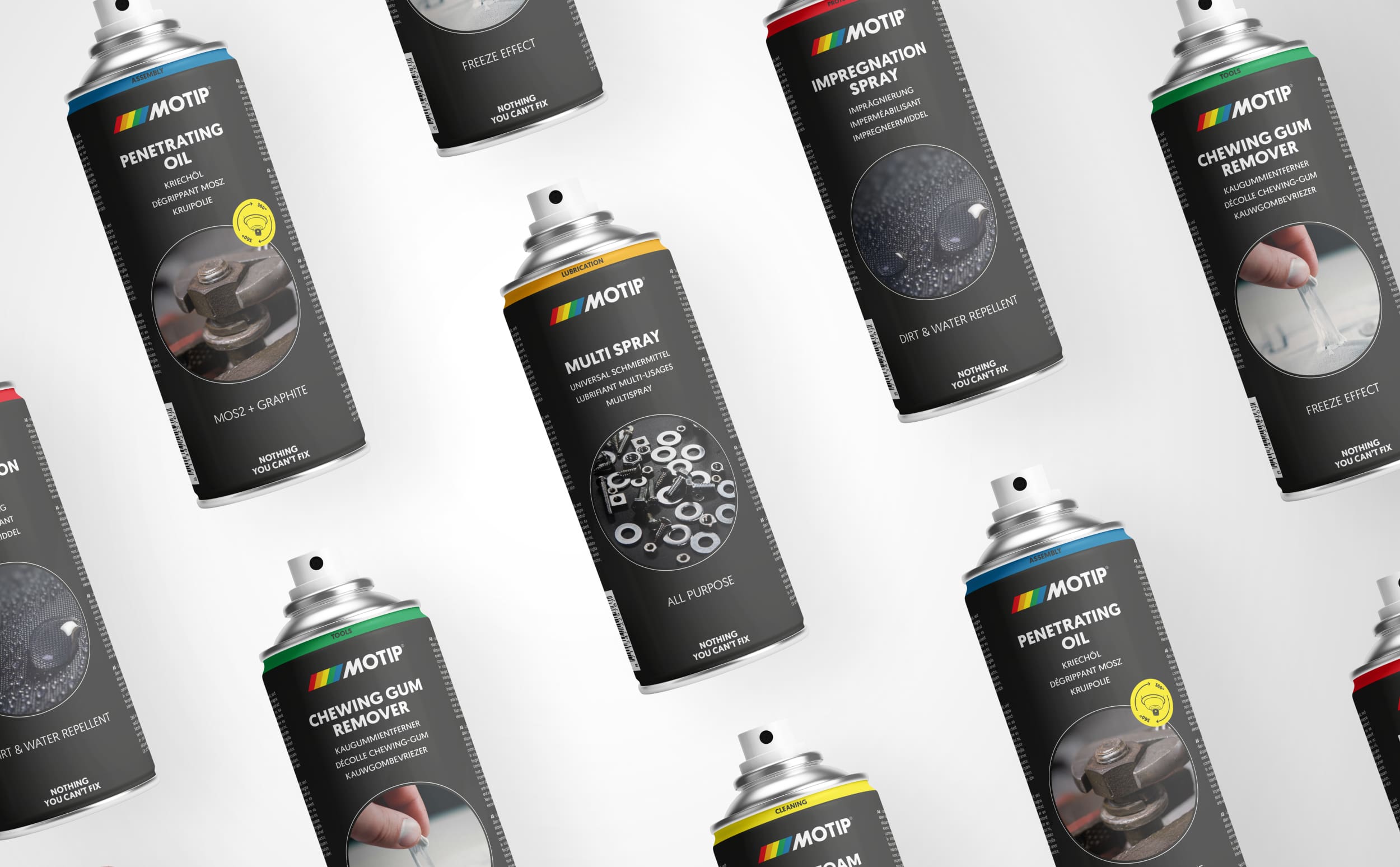 Ondertussen kreeg de hele verpakkingslijn een update: de productfuncties werden duidelijker gemaakt met gekleurde banden en we ontwierpen een iconenset in verschillende formaten in de stijl van het logo. De gebruiksregels van de iconen en het logo schreven we op in een brandbook, waar ook de fotografiestijl in werd meegenomen. Donker, moody, clean, maar ook rauw en mannelijk: met een flink aantal voorbeelden, do’s en dont’s weten ze bij MOTIP precies wat te doen. En zo zou je kunnen concluderen dat ook bij ons geldt; ‘We get the job done. Nothing we can’t fix!’