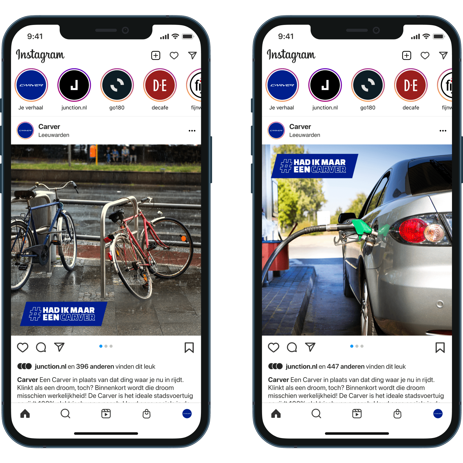 Om Carvers online naamsbekendheid te laten groeien, communiceerden we in de vorm van verschillende campagnes op de socials en maakten we gebruik van display banners om mensen naar de website te trekken. Offline waren we minstens zo zichtbaar. Zo was Carver op 325 A0-posters in Amsterdam, Den Haag, Rotterdam en Utrecht te vinden. En waar de posters in het oog sprongen, bevonden 120 krijtmarkeringen met #hierpasteencarver zich letterlijk onder je voeten. Vaak bij bushaltes en parkeerplaatsen om het parkeergemak van het voertuig te onderstrepen.