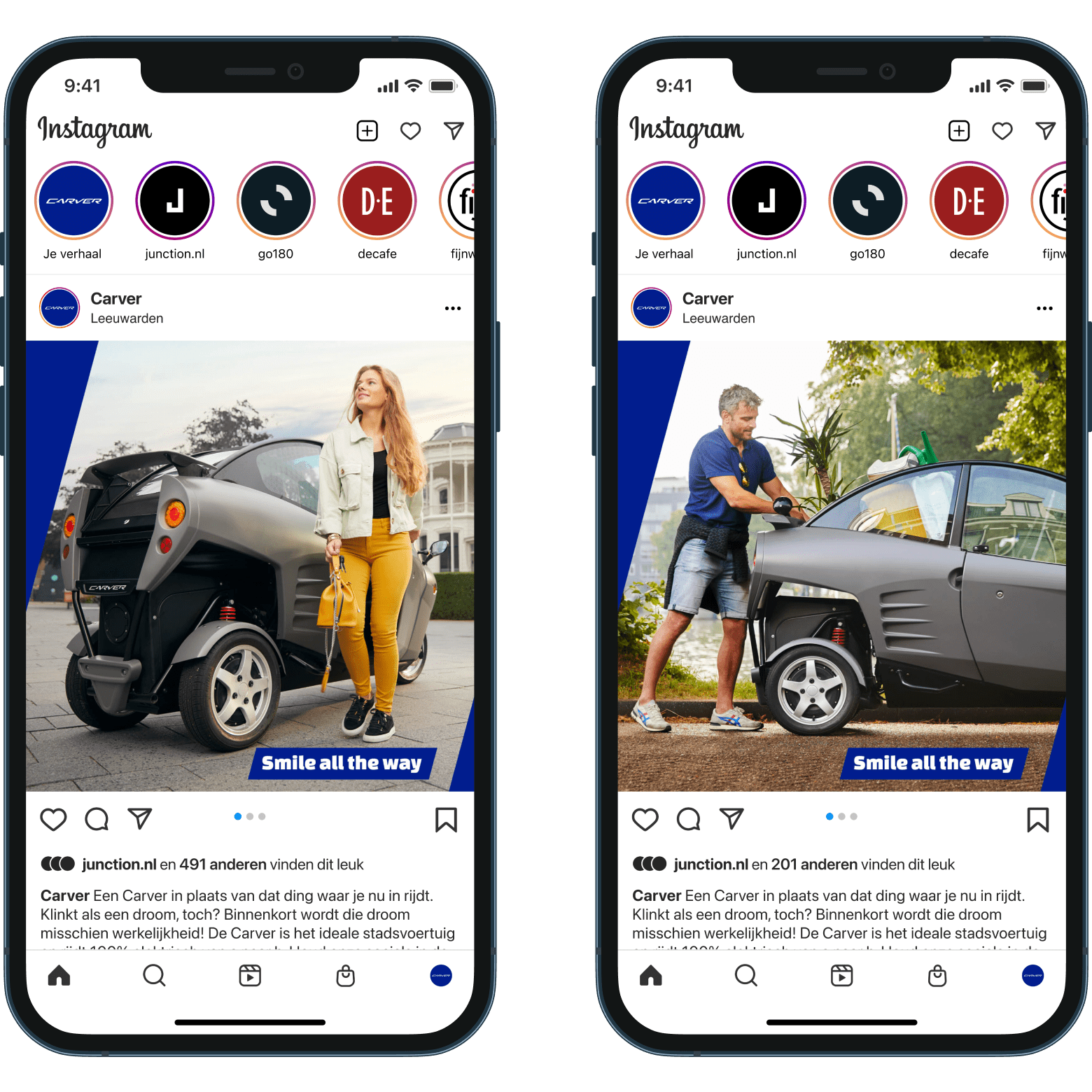 Zoek je een duurzaam alternatief voor je auto of scooter? Meet Carver, hét leukste elektrische tweepersoons alternatief voor op de weg. Om heel rijdend Nederland kennis te laten maken lanceerden we een naamsbekendheidscampagne onder de naam ‘Smile all the way’. Geholpen door influencers en pers gingen we, gewapend met doelgerichte on- en offline middelen, de straat op. Waar Carver zelf al een bijzondere verschijning op straat was, kunnen mensen na deze campagne helemaal niet meer om het voertuig heen.