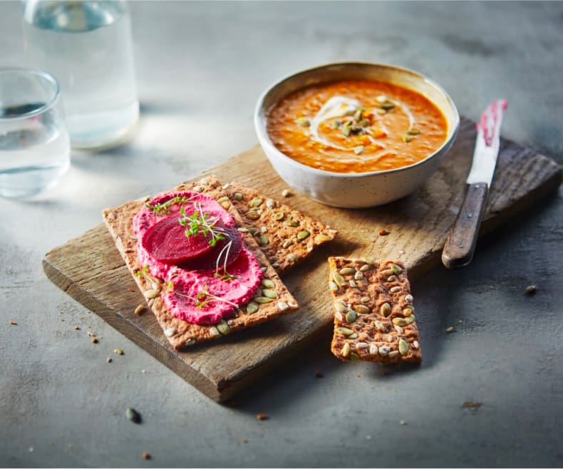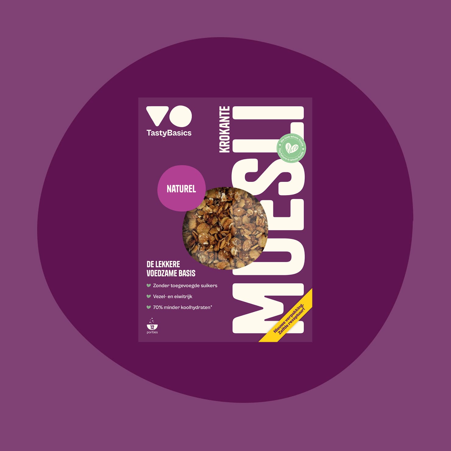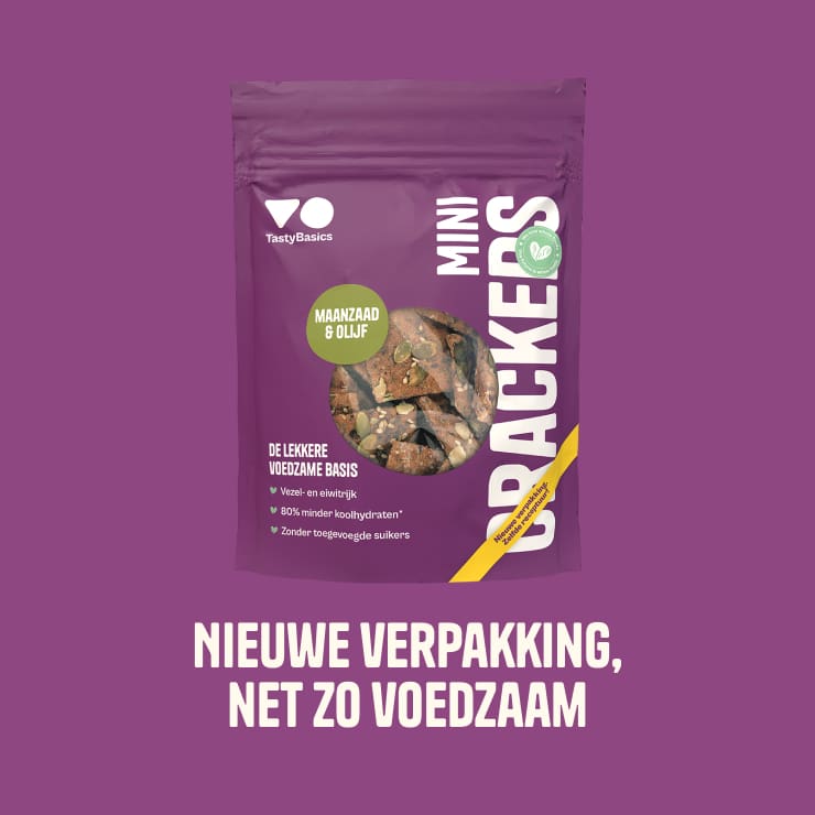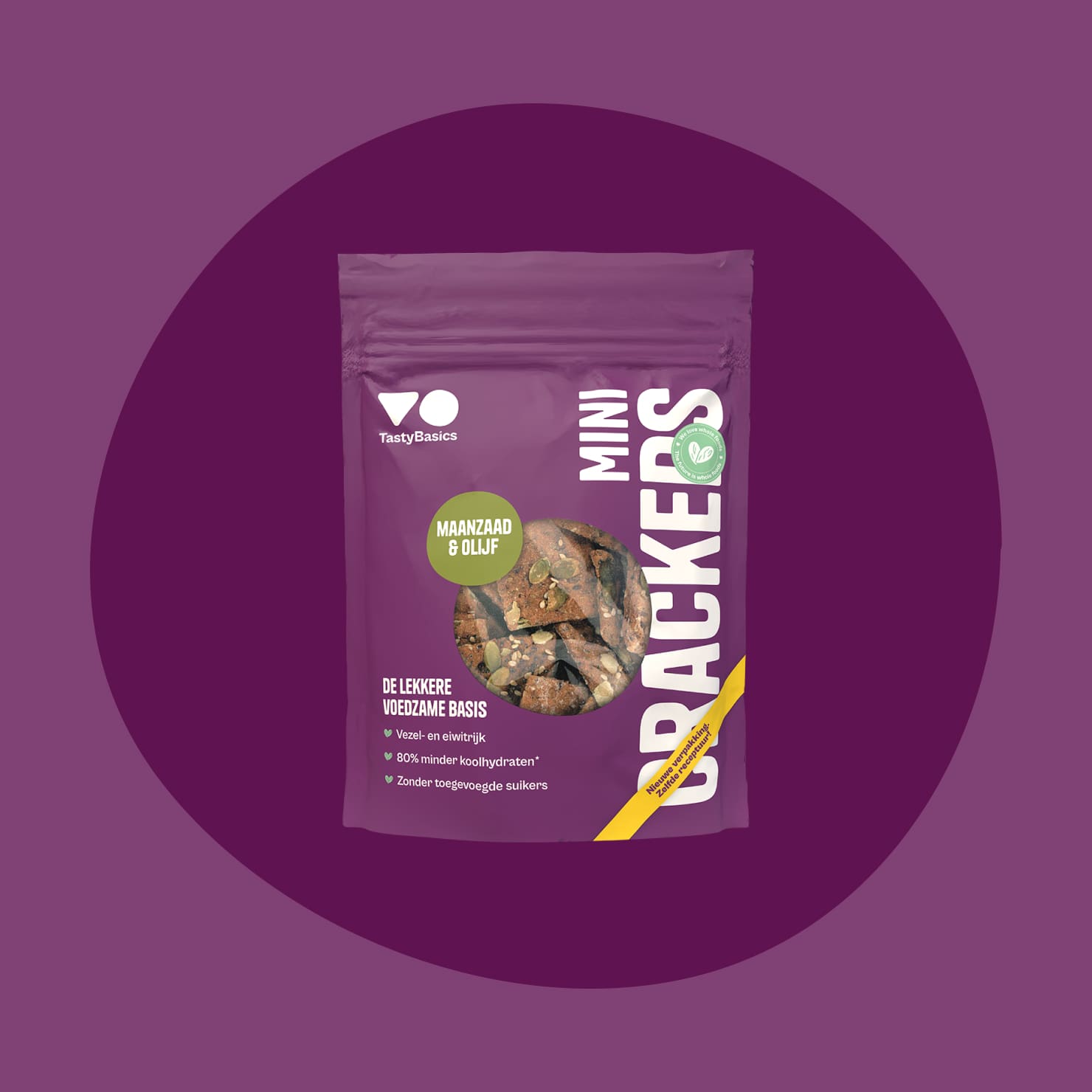 Het jasje dat we jaren geleden voor TastyBasics ontwierpen, begon stilletjesaan te knellen. Bij een challenger rol hoort immers óók een challenging uiterlijk. Het doel? Opvallen! Onze designers moderniseerden het logo en maakten een bold move door paars als basiskleur te nemen voor de gehele visuele identiteit. Een kleur die je verder nergens spot in de schappen. Extra opvallend is de verticale positionering van het TastyBasics-logo. De ‘kijkgaten’ in de verpakking en de stickers op de crackers en het brood onthullen alvast wat voor lekkers je in huis haalt. Lekker transparant!