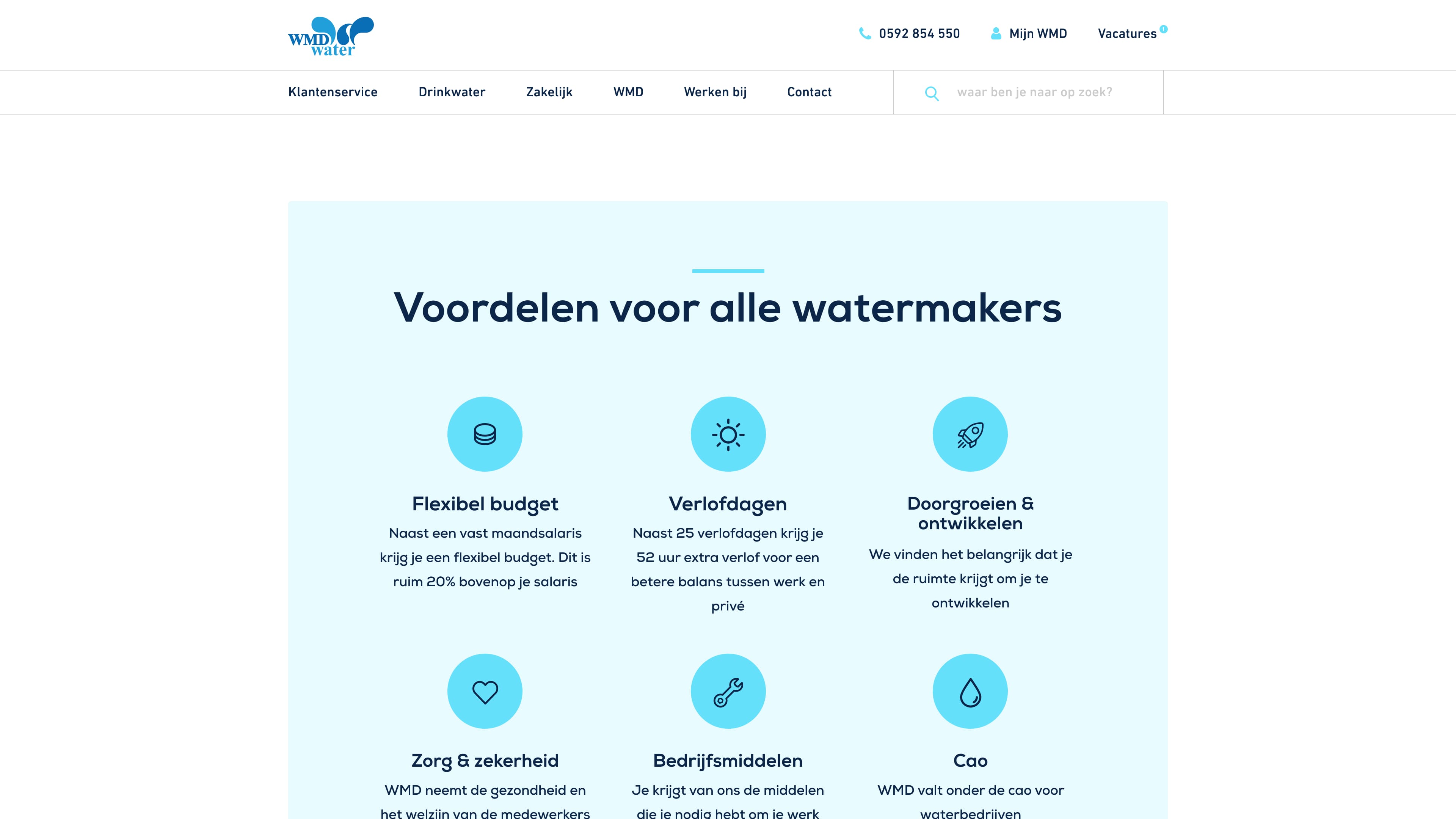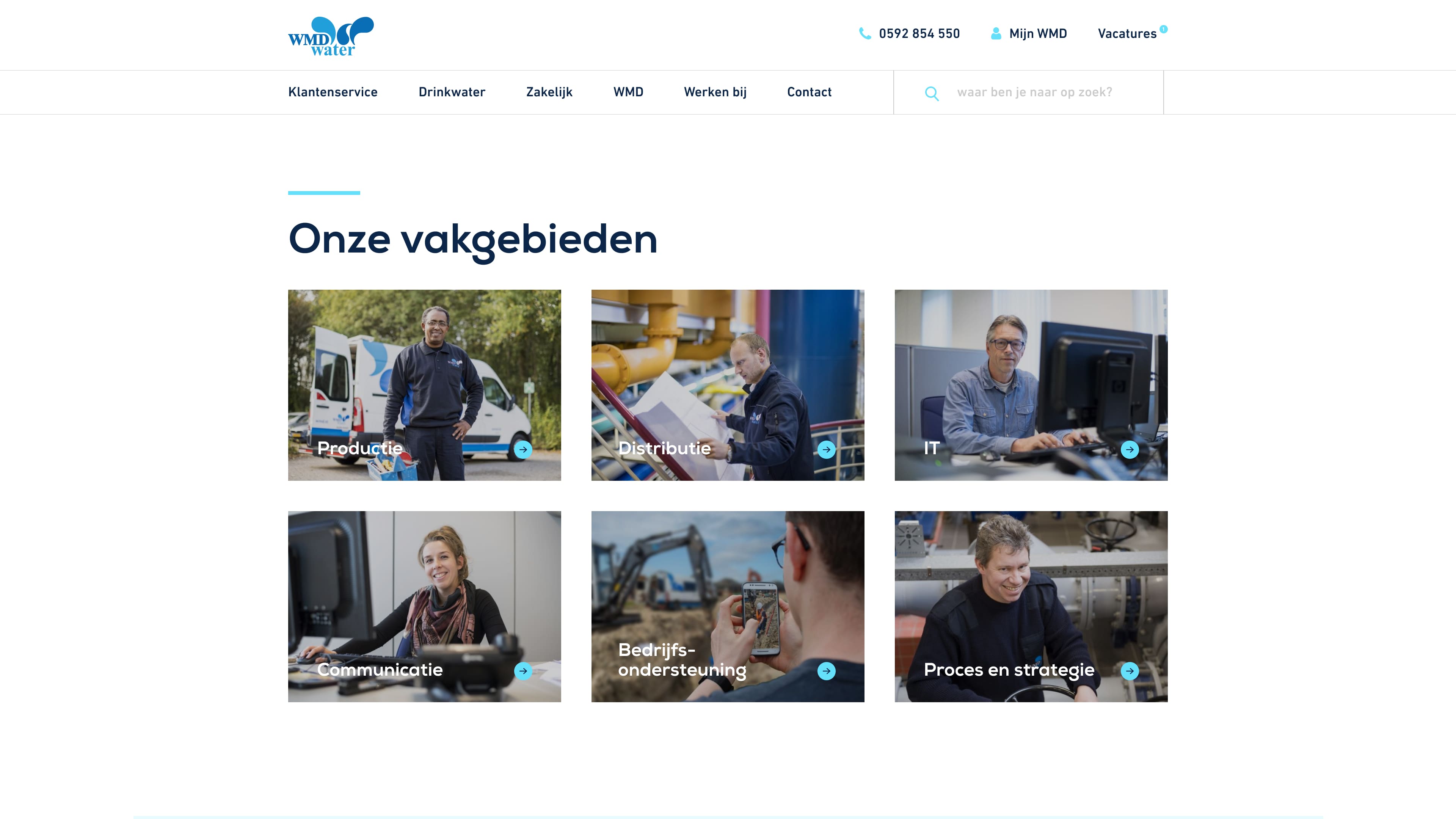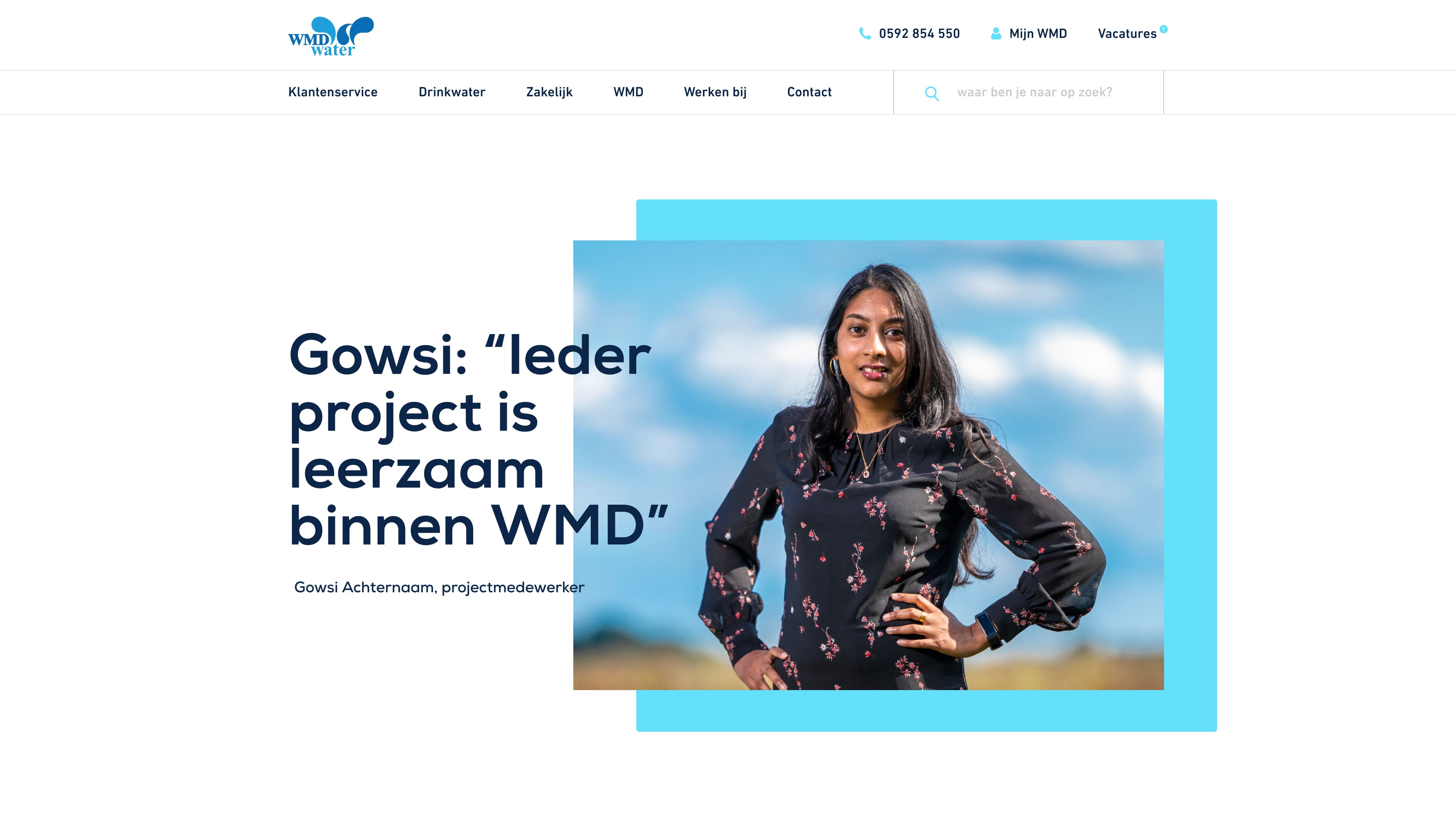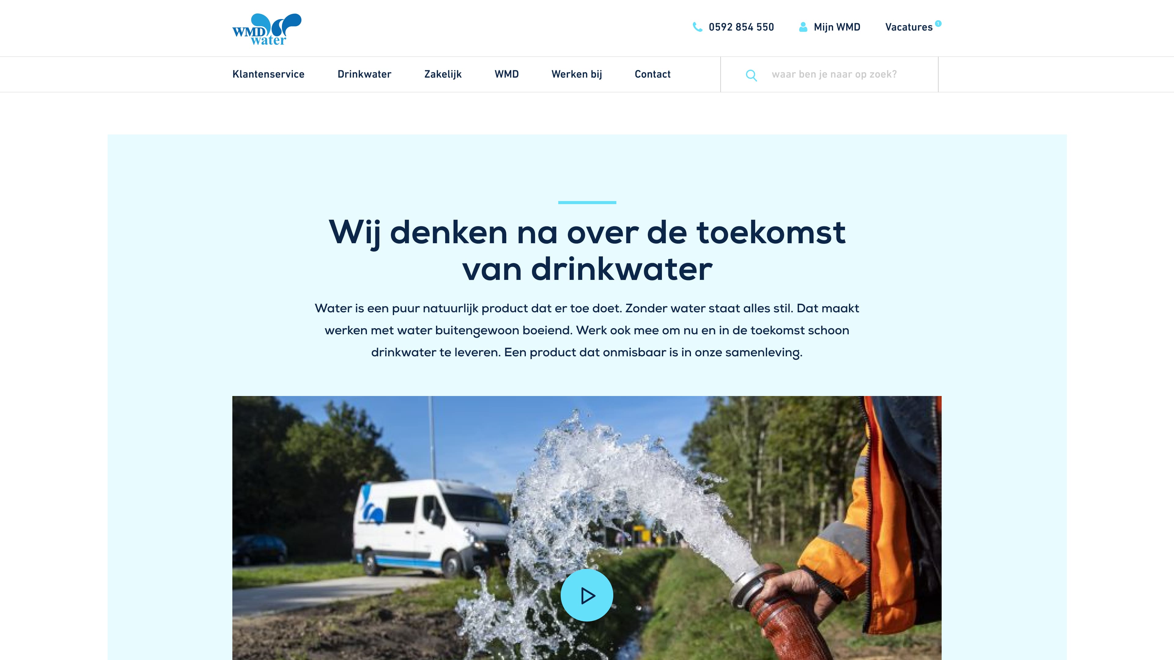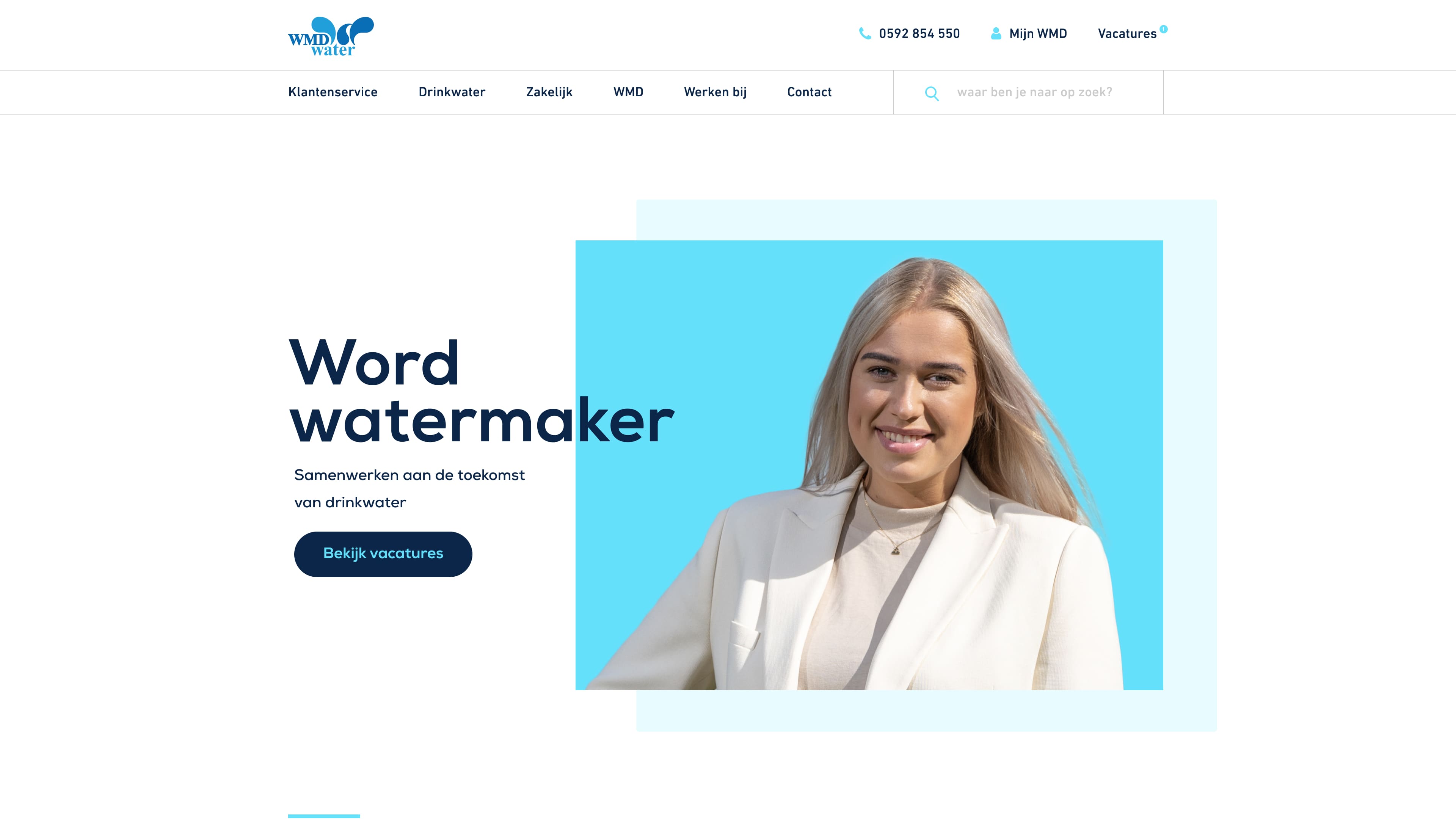 Water. Als je erover nadenkt, is het helemaal niet zo vanzelfsprekend dat het elke dag uit je kraan stroomt. Om daarvoor te zorgen, zijn mensen nodig. En die mensen, die werken bij WMD. Al meer dan tachtig jaar levert WMD drinkwater in Drenthe. Dat doen ze betrouwbaar, betaalbaar én duurzaam. Wij bedachten het creatieve haakje voor een arbeidsmarktcampagne, om meer watermakers naar WMD te halen. Zodat zij door kunnen met waar ze goed in zijn: bijna een half miljoen Drenten voorzien van hun eerste levensbehoefte, water!